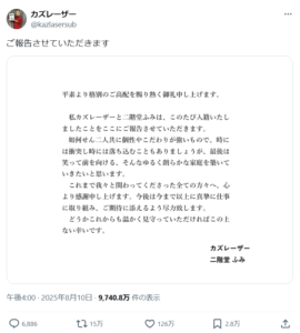 カズレーザーさんは自身のXで、「いかんせん2人共に個性やこだわりが強いもので、時には衝突し時には落ち込むこともありましょうが、最後は笑って前を向ける、そんなゆるく朗らかな家庭を築いていきたいと思います」などとコメントしている。