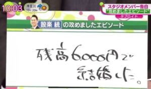 そんな中、設楽が語ったのが「残高6000円で結婚した」こと。「結構前ですけど、結婚決めた時の(預金の)残高が6000円でしたから。でも今は何とかなってます」とさらりと打ち明け、大久保からは「正気?正気ですか?すげえな」驚きの声が。