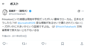 娘さんが現地の中学校に通っていたことを、高橋洋一さんがXで投稿されていました。