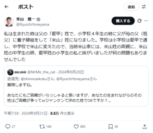 米山隆一さんは、幼少期の頃は父親の姓の『愛甲』の姓だったそうです。