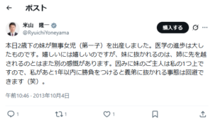 米山隆一さんは、2013年に2歳年下の妹が第一子を出産したことを自身のXで報告しています。